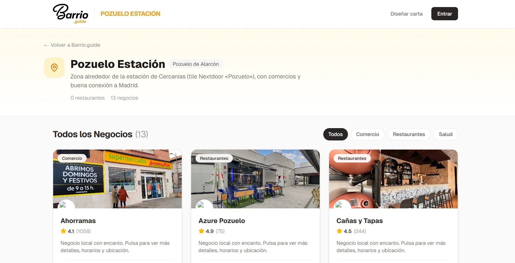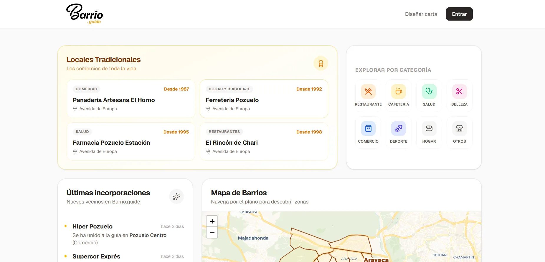 Barrio.guide es una plataforma que conecta a los comerciantes locales con las personas que viven en su entorno. Funciona como un directorio de negocios por zonas, diseñado según cómo los vecinos perciben su propio barrio: calles, plazas y microrregiones urbanas con identidad.